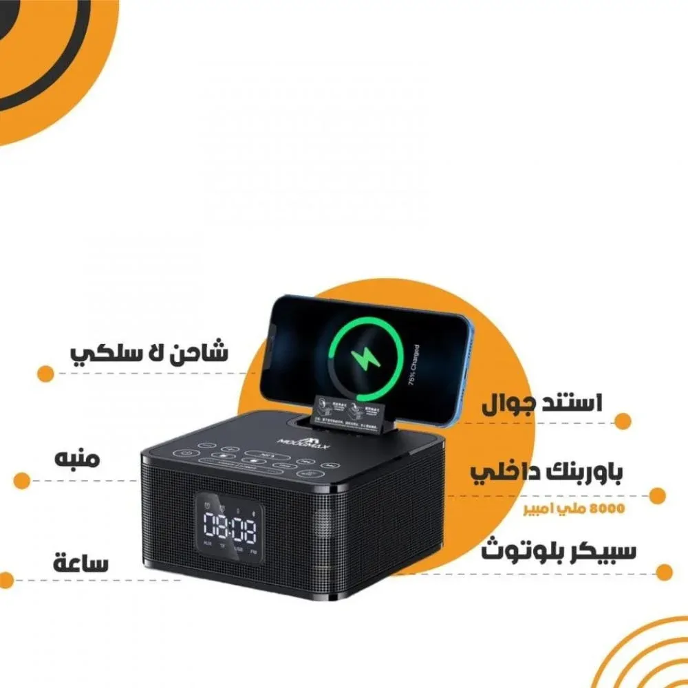 مكبر صوت بلوتوث و منبه وشاحن لاسلكي